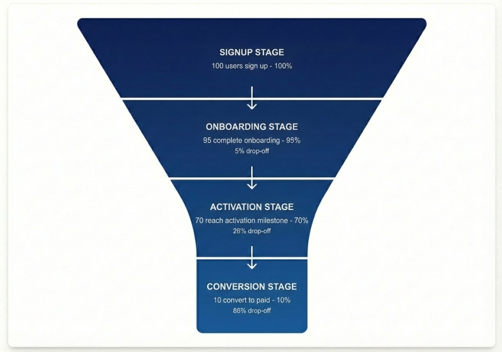 WysLeap shows you exactly where YOUR users drop off. Typical PLG funnel: 100 signup → 95 complete onboarding (5% drop-off) → 70 activate (26% drop-off) → 10 convert (86% drop-off). Identify your specific drop-off points and optimize.